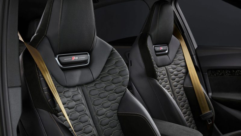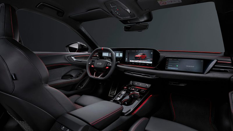 Visually, the RS5 gains wider tracks than the regular A5, flared fenders reminiscent of the original Ur‑quattro, and a three‑dimensional honeycomb grille paired with dark Matrix LED headlights and matte oval exhausts. Inside, a three‑screen cockpit (11.9‑inch digital instrument cluster, 14.5‑inch central screen and 10.9‑inch passenger display) integrates RS‑specific data and a lap‑timer function.