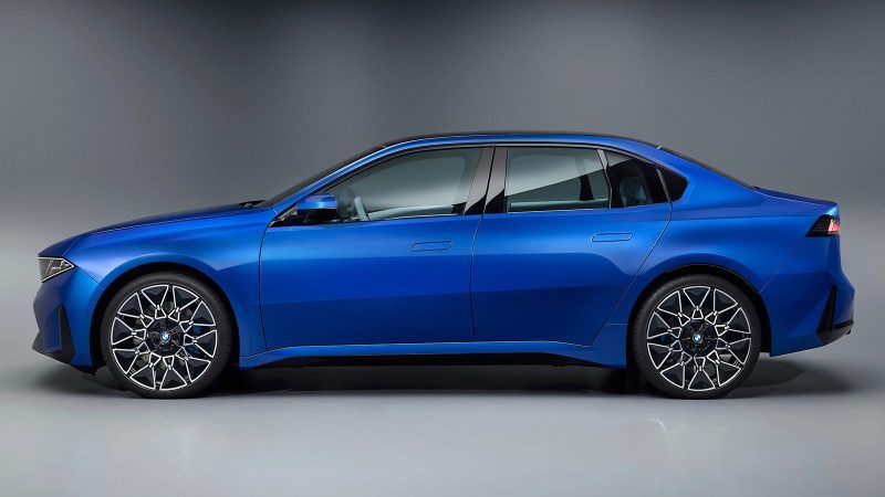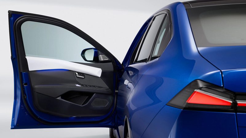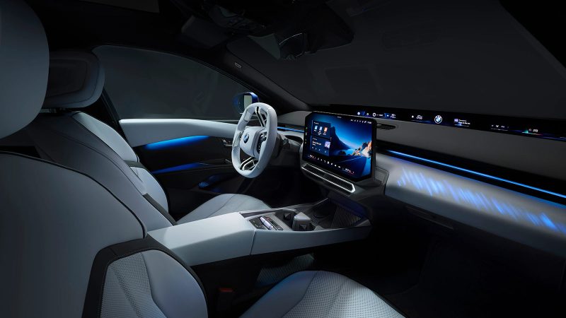 Slim LED headlights and clean surfacing reduce visual noise, while the overall silhouette leans toward a classic three-box sedan proportion rather than the crossover-heavy direction of many recent EVs. The result is a shape that feels both forward-looking and grounded in BMW’s design heritage.