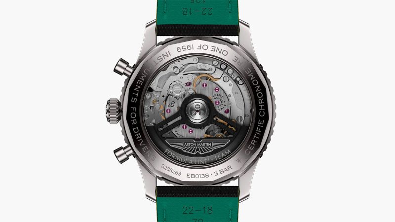 At its core, the watch uses Breitling’s in‑house B01 calibre, an automatic chronograph movement with a 70‑hour power reserve and column‑wheel construction. The movement sits inside a 43mm titanium case that is just 13.69mm thick and weighs a svelte 96.95 g. A carbon‑fiber dial evokes F1 cockpit components, while green accents pick up the Aston Martin Aramco livery. The bidirectional slide‑rule bezel and 1/4‑second, 30‑minute and 12‑hour counters retain the classic Navitimer functionality, and a sapphire case back reveals the rotor, which is etched with the Aston Martin Aramco logo.