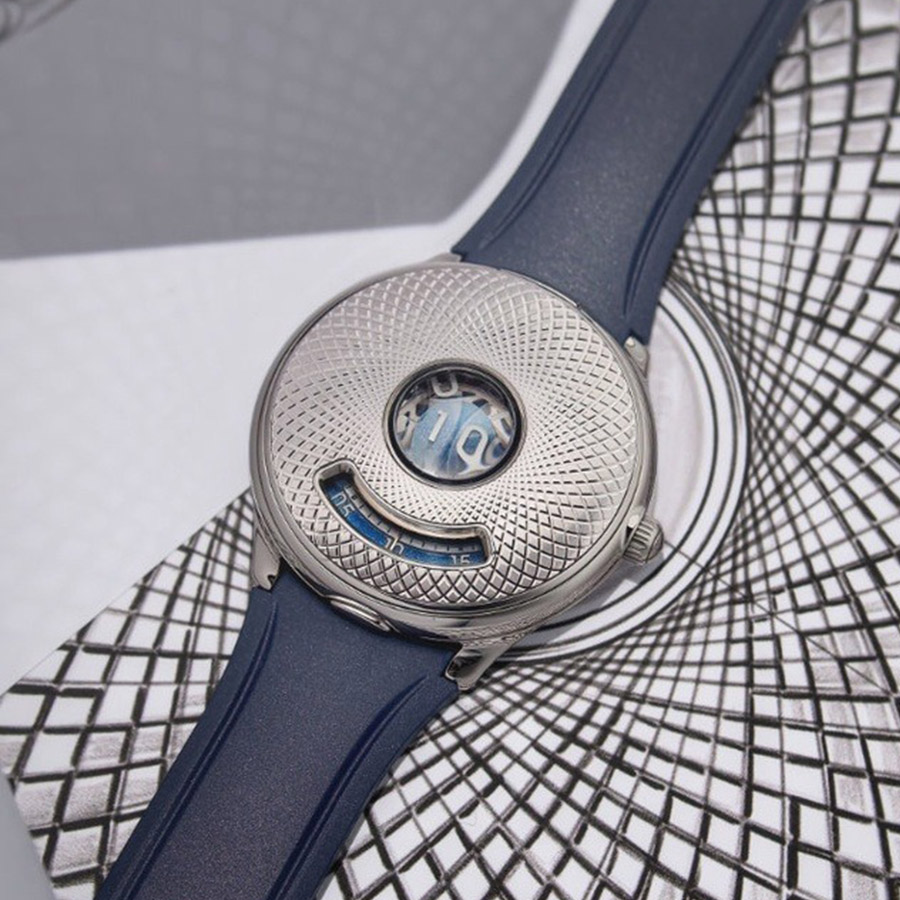 The half-hunter cover introduces one of the watch’s most arresting elements: a Singularité guilloché pattern that creates an optical illusion reminiscent of a spiraling black hole. At its center, a bubble-shaped loupe showcases the hour display, turning the watch face into a miniature “cockpit.” Open the cover, and the full architecture of the movement is revealed—complete with flying tourbillon, a seven-day power reserve, and a distinctive three-segment power-reserve display.