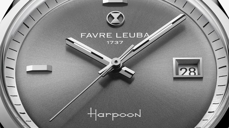 The grey dial stays true to the 1966 spirit while adopting a modern sunray finish. Applied rhodium‑plated hour markers are oriented horizontally at 12, 6 and 9 o’clock, an unconventional detail that sets the Harpoon apart from typical dive watches.