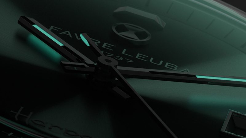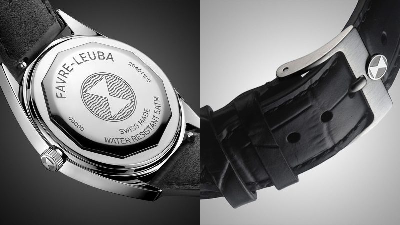 A metallic frame surrounds the date window at three o’clock, and rhodium‑plated hands filled with Super‑LumiNova ensure legibility in low‑light conditions. The watch comes on a black leather strap with quick‑release spring bars, secured by a pin buckle bearing the Favre Leuba signature.