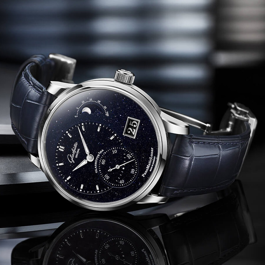 At 40mm in diameter and 12.8mm thick, crafted entirely in platinum, the case exudes weight and prestige while maintaining wearability. The aventurine glass dial is the star of the show, shimmering like a starry night sky with copper inclusions and paired with a mother-of-pearl moon floating across its surface. The signature Panorama Date remains, balancing the asymmetric dial layout with precision and elegance.