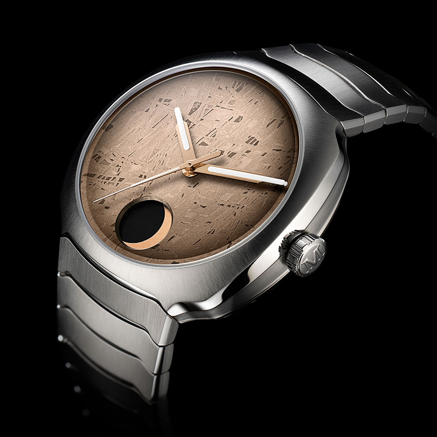 Framed by a 40mm steel case, the dial is a literal shard of the universe: a sliver of the Gibeon meteorite that crashed in Namibia. The natural iron-nickel Widmanstätten pattern is treated with a golden tone and Moser’s signature fumé gradient, creating a depth that feels as vast as space itself.