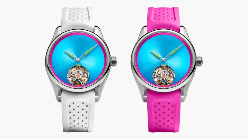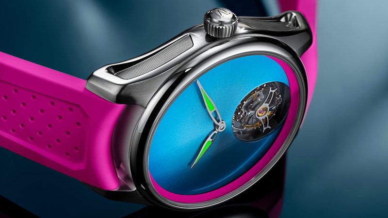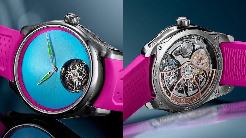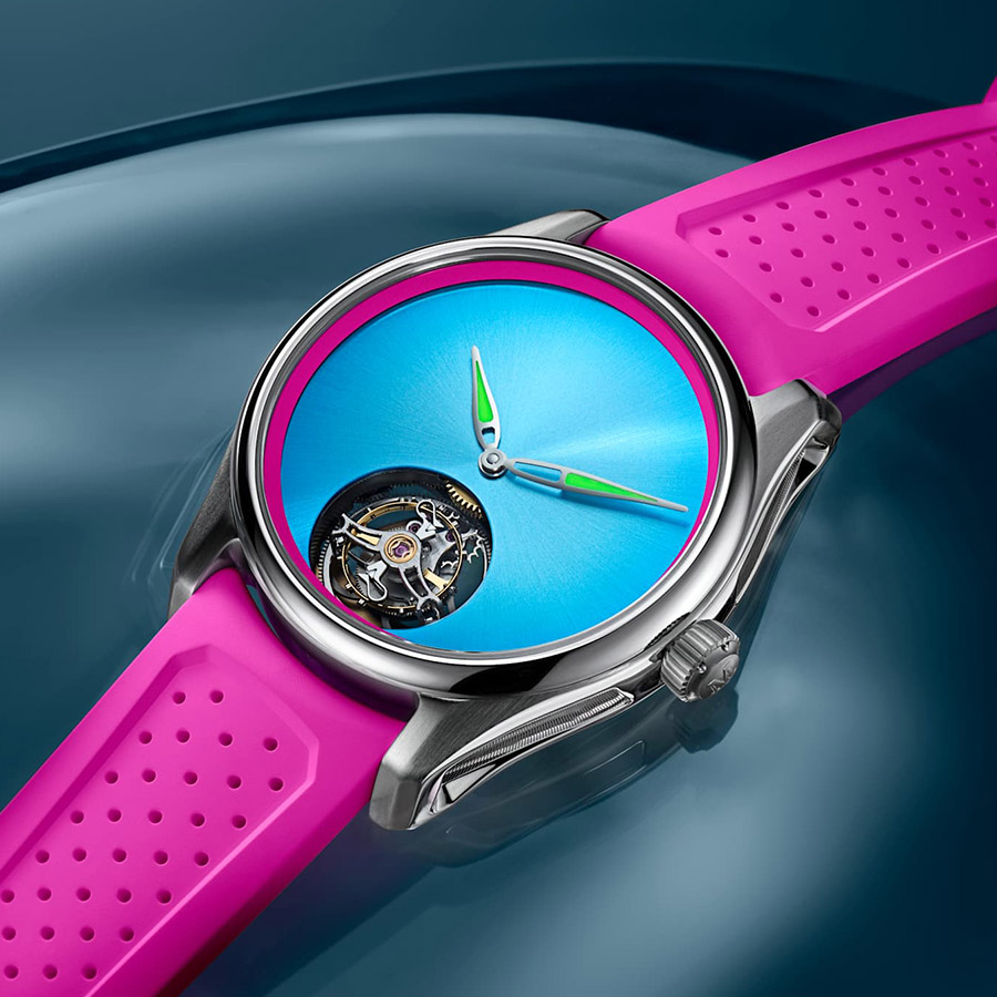 H. Moser & Cie. has partnered with Bucherer to reinterpret one of its most technically ambitious pieces through a distinctly regional lens. The Pioneer Tourbillon Miami builds on the brand’s 40 mm Pioneer case, introducing a vivid blue fumé dial framed by a pink flange—a combination that draws from Miami’s Art Deco architecture and pastel skyline. The result is a watch that departs from traditional tourbillon restraint without abandoning the clarity and balance that define Moser’s design language.