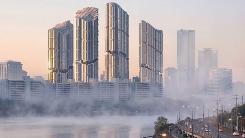 Presented to residents earlier this year, the plan replaces a 1975 complex with four flowing towers surrounding a sky garden and open ground level. The rooflines are shaped to echo the mountain silhouettes around Seoul, creating a softer profile than the repetitive high‑rises that dominate the city.