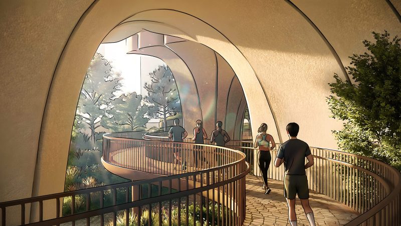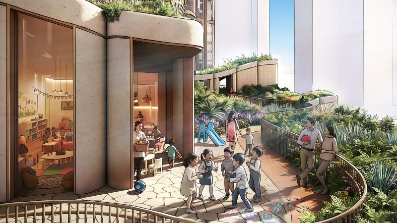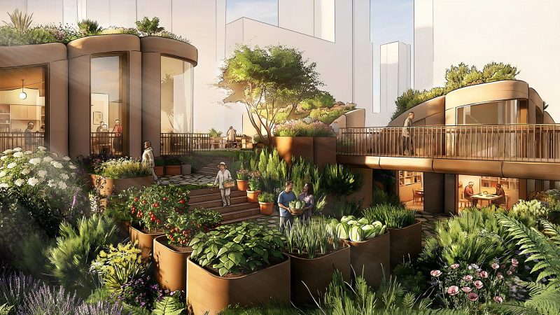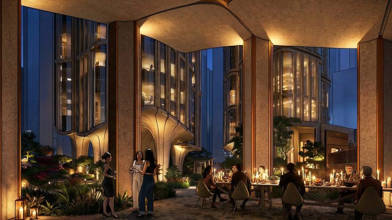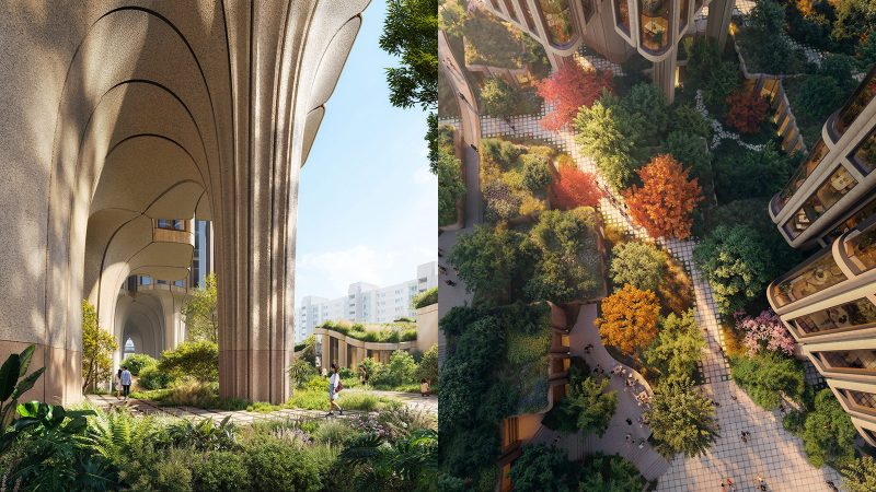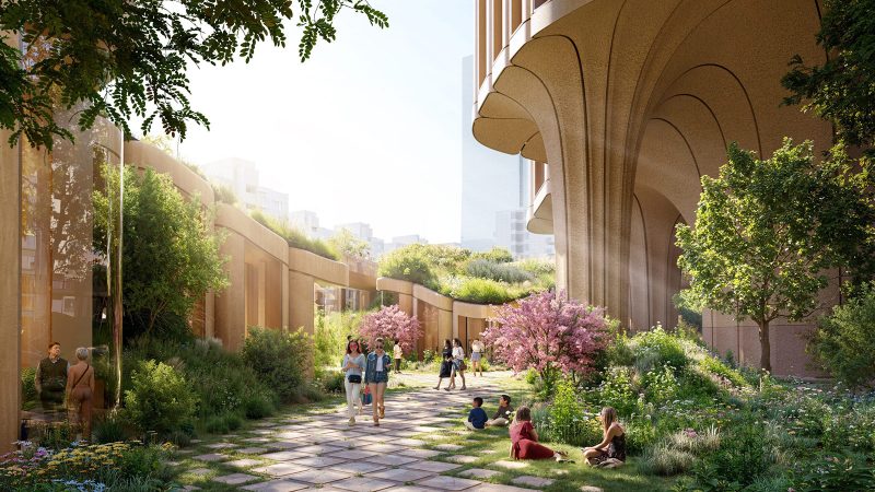 At ground level, the design introduces subterranean courtyards, shaded walkways and terraced gardens intended to buffer the site from traffic while providing residents with quiet green space.