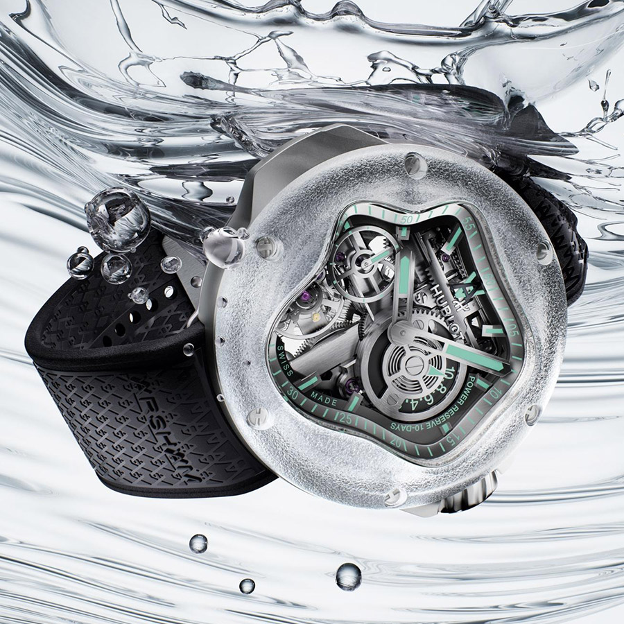 At the heart of the watch lies Hublot’s in-house HUB1205 Meca-10 manual movement, offering a 10-day power reserve and visible through both the sapphire dial and caseback. Its fluid, splash-shaped dial cutout is a nod to the organic inspiration behind the design. At the same time, Arsham’s signature green Super-LumiNova accents breathe life into the numerals, hands, and power reserve indicator. Despite its artistic sensibility, this timepiece is built for performance, boasting 100m of water resistance and Hublot’s hallmark six H-shaped screws that secure its structure.