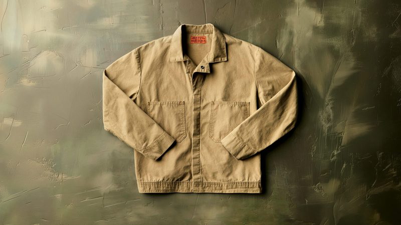 The garment is sewn in the United States from heavy sulfur‑dyed Japanese canvas that develops character with wear. Its design combines the practicality of a chore coat with the cleaner lines of a tailored jacket.