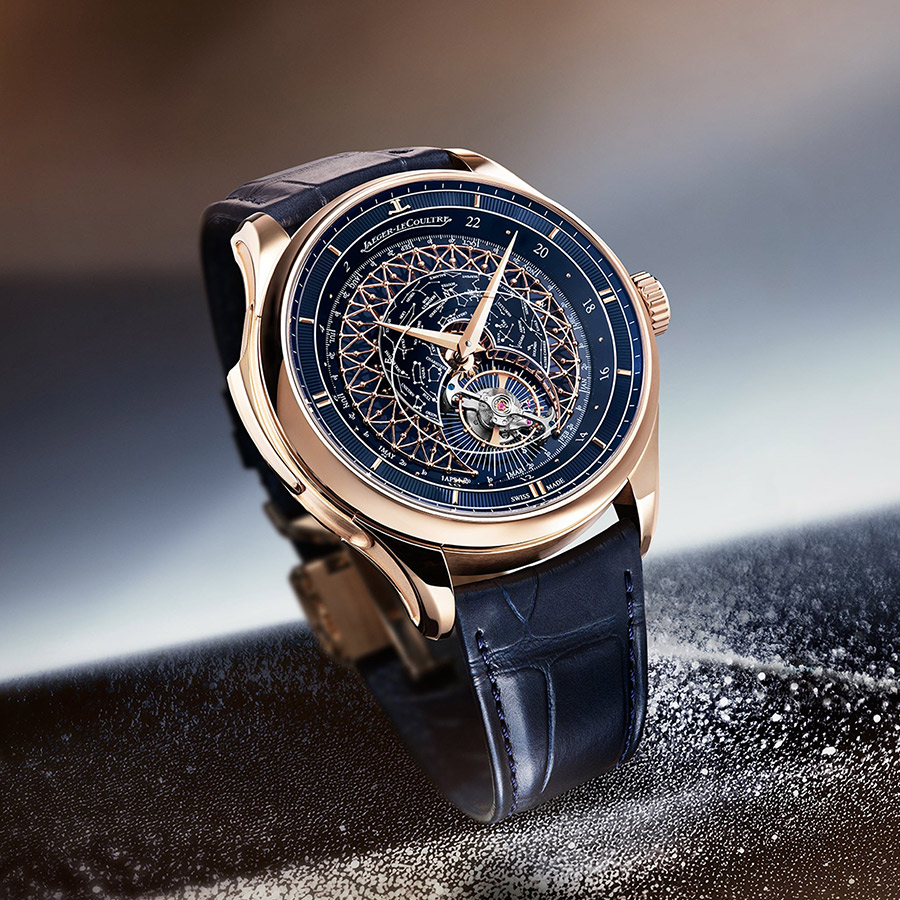 The 45 mm case and triple-tiered dome dial are hand-finished by Jaeger-LeCoultre’s Métiers Rares™ atelier, revealing an intricate “Atomium” lattice inspired by constellations. The dark-blue enamel dial, with its luminous constellations, creates a hypnotic sense of depth and motion that blurs the line between engineering and artistry.