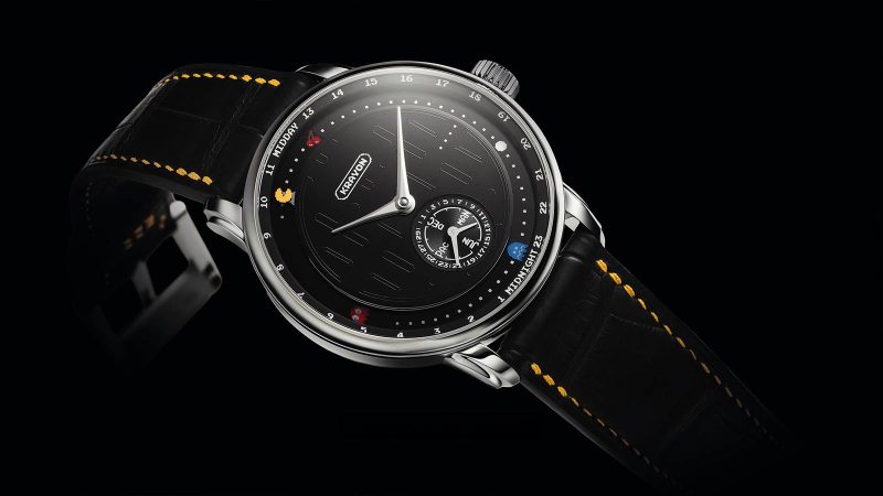 Each 39 mm piece features an onyx dial etched with the maze from the 1980 arcade game. Pac‑Man himself serves as the 24‑hour indicator, while four ghosts change colour to indicate sunrise time and a cookie marks sunset. A long pointer hand shows the date and a shorter pointer the month; fruit appears at midday and midnight, and at midnight the ghosts turn blue.