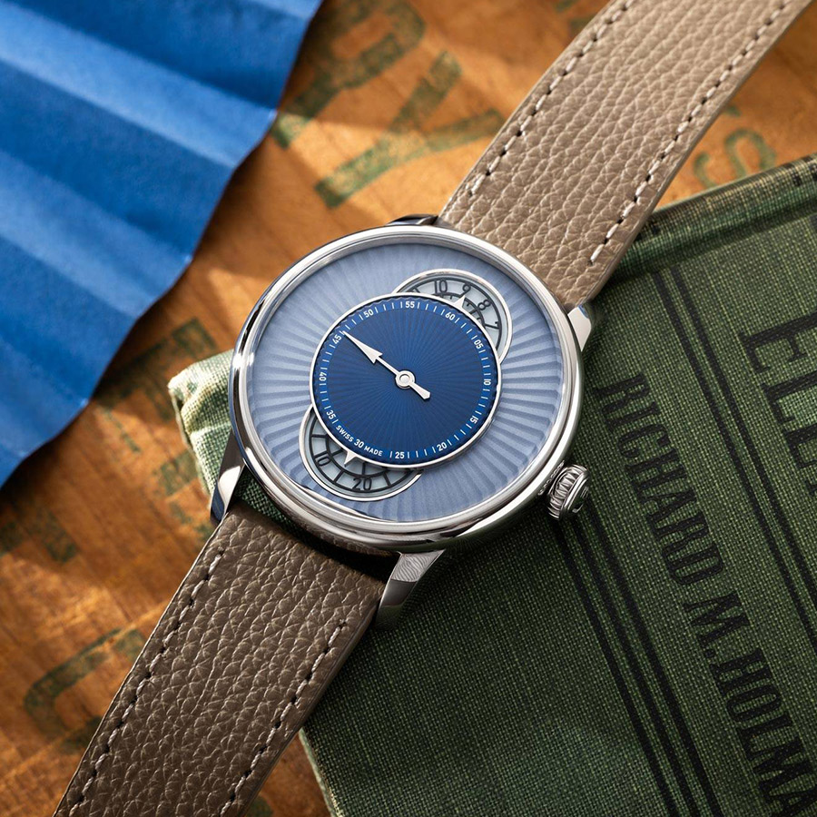 The regulator format—separating hours, minutes, and seconds—provides the perfect canvas. Here, it’s executed across three distinct dial planes. A near-white base supports skeletonized hour and seconds discs that appear to float as they rotate. Above that, a fluted light-blue minute ring adds rhythm without visual noise. The topmost layer, finished in deep-lacquered cobalt, anchors the composition with crisp white numerals and indices, delivering instant legibility and bold contrast.