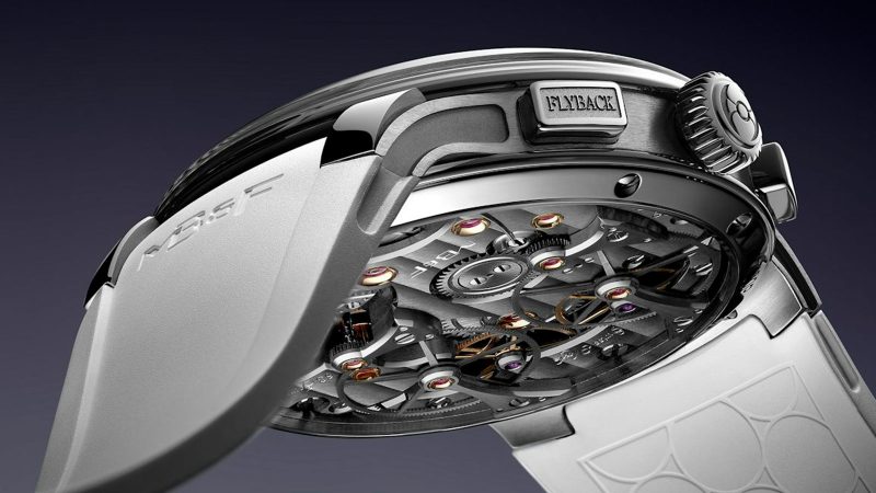 A screw‑down crown and integrated white rubber strap give the EVO 80‑metre water resistance, while MB&F’s proprietary FlexRing shock‑absorption system protects the movement from hard knocks. The manual‑winding calibre consists of 621 components, including two double barrels that provide a 72‑hour power reserve. Operating the chronographs is intuitive: pushers at 2 and 4 o’clock control the left timer, those at 8 and 10 o’clock control the right, and the Twinverter rocker at 9 o’clock swaps their modes. The new flyback function resets and restarts each chronograph with a single press, ideal for timing laps or intervals.