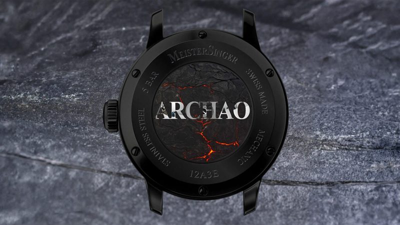 A domed sapphire crystal covers the grainy dial, and an exhibition back with mineral glass allows a view of the movement and the stylized ‘Archao’ script printed across a volcano‑inspired motif. The watch is water resistant to 5 bar and measures 12.3 mm from front to back.