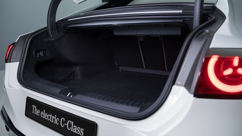 Visually, the sedan maintains the proportions that have defined the C-Class for decades, but the details shift toward a more EV-specific aesthetic. A large, over-sized grille dominating the front fascia replaces the traditional grille, while carefully sculpted surfaces guide airflow along the body. Flush door handles and optimized wheel designs contribute to reduced drag, reinforcing Mercedes-Benz’s focus on real-world range rather than headline figures alone.
