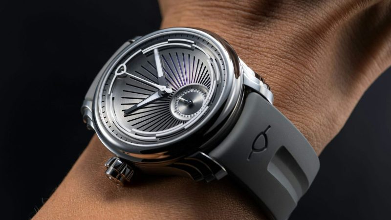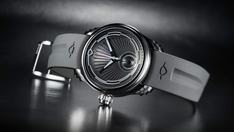 Its dished grey dial features radial cutouts that reveal a baseplate treated with a multicolored coating; luminous accents use MING’s proprietary Polar White and Super‑LumiNova X1 pigments to ensure legibility. At 40 millimeters across, the stainless‑steel case relies on multi‑piece stepped lugs that mix brushed and polished surfaces, evoking a modern take on Art Deco design. The case is water‑resistant to 100 meters.
