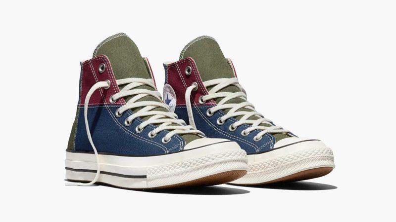 The first is a high‑top constructed from panels of olive green, navy blue and maroon canvas, stitched together in a patchwork reminiscent of vintage quilts. Suede overlays reinforce the eyelets and toe, and a clean white foxing and midsole keep the silhouette grounded in the Chuck’s heritage. Branding is subtle: a tiny Noah logo appears on the insole, and the heel license plate adds a small co‑branded tab.