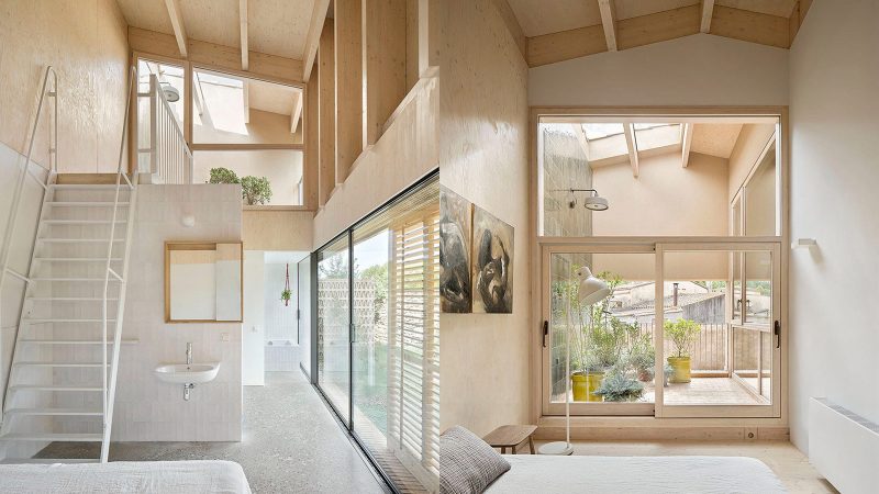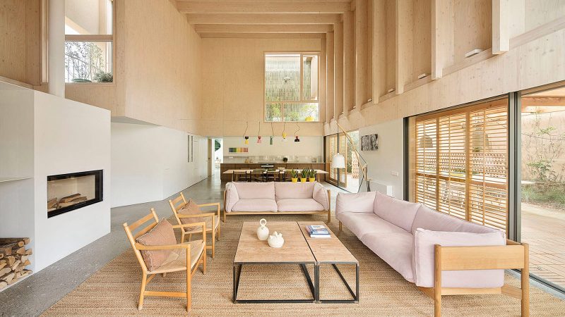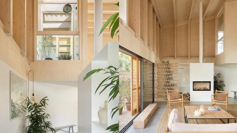A cross-laminated timber (CLT) framework, supported by metal pillars, forms the home’s structural backbone—its ribbed woodwork reminiscent of an inverted ship’s hull, or “Pinocchio’s whale,” which inspired the house’s name. This expressive use of local, sustainable materials underscores PMMT Arquitectura’s commitment to environmental responsibility and pre-industrialized construction.