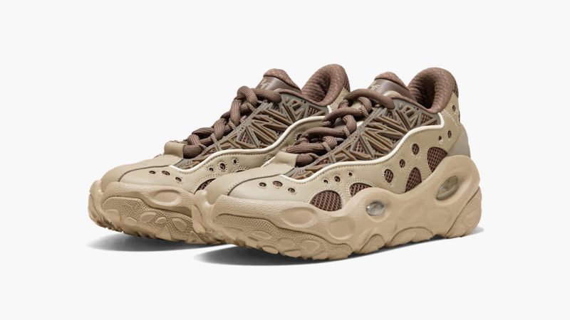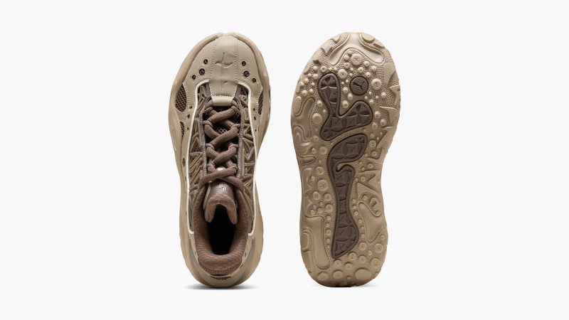 The layered mesh and textile upper adds depth without weighing the shoe down. Mocha accents along the laces and lining sharpen the contrast, while a sculpted TPU cage wraps the midfoot with a geometric sidewall pattern to provide structure. Clear oval windows in the midsole reveal cushioning elements and lend the RNR a technical edge PUMA has kept the tooling versatile, so this model transitions from trail runs to city streets with ease. The Ice Coffee/Flat Bronze colorway will resonate with those who prefer understated palettes.