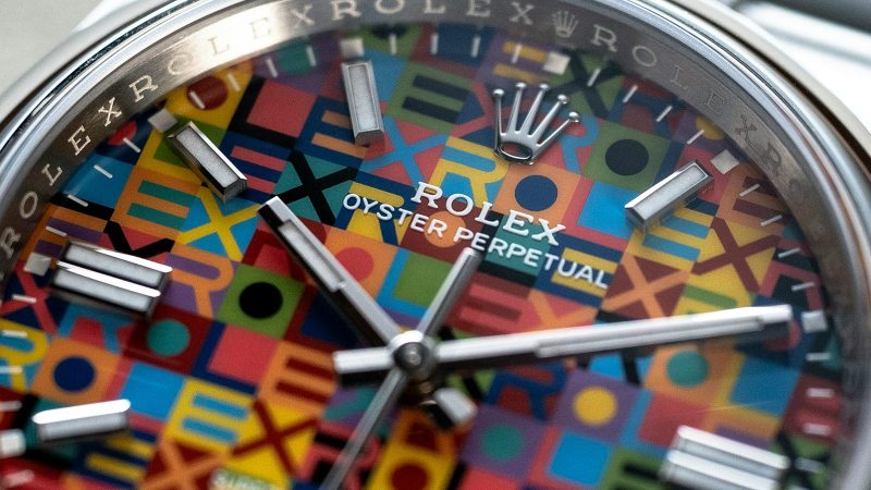 At first glance, the dial reads as a mosaic of color. On closer inspection, the composition reveals itself as a pattern formed from the letters of “Rolex,” arranged in a repeating, almost abstract grid. Each of the ten colors is applied individually using pad printing, a process that demands extreme precision and consistency. The result is less about visual excess and more about demonstrating control—each hue placed deliberately, each edge crisply defined.