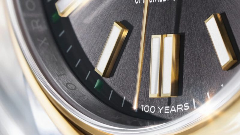 The slate dial serves as the focal point, where Rolex replaces the traditional “Swiss Made” text with a discreet “100 years” inscription at six o’clock. Additional green accents—seen in the Rolex signature and minute track markers—tie the design back to the brand’s longstanding visual identity.