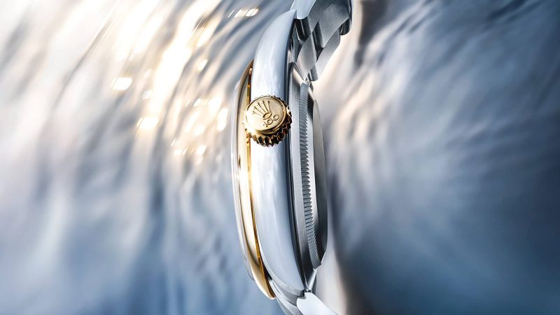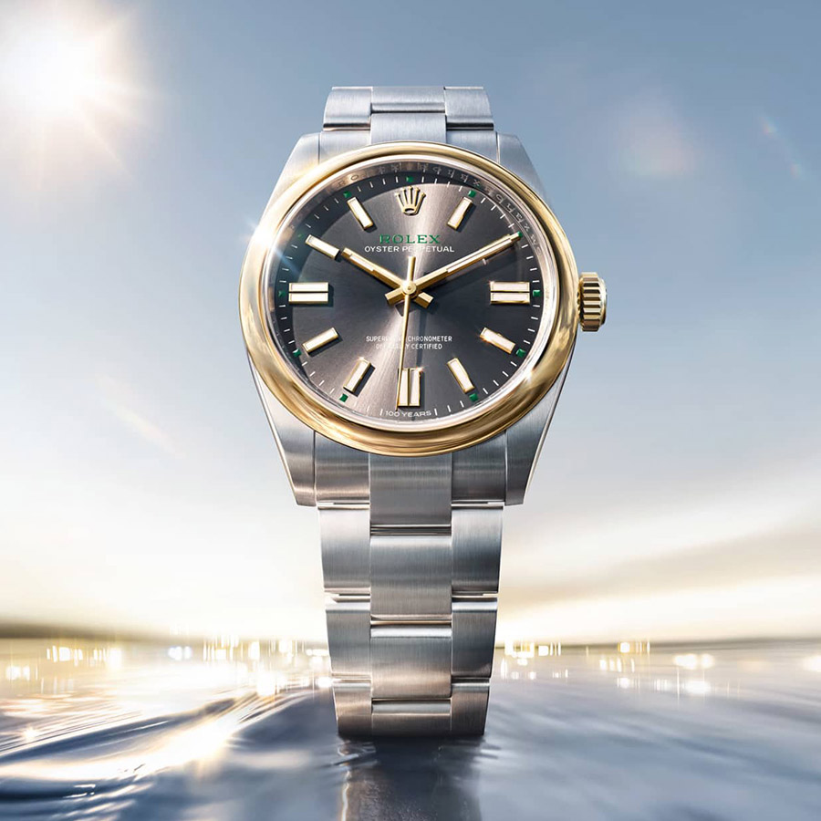 Several details extend the centennial narrative beyond the dial. The winding crown itself is engraved with the number “100,” a quiet nod that is only visible upon closer inspection. These restrained flourishes align with the broader philosophy of the Oyster Perpetual line: clarity, proportion, and functional elegance over decorative excess.