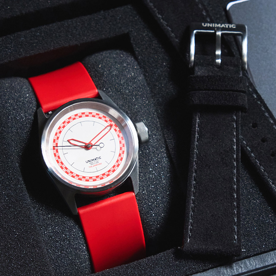 Powering the “10.15” is the dependable Sellita SW200-1 automatic movement, offering a 41-hour power reserve. Each piece ships in a special Unimatic x The Armoury case and comes with two interchangeable straps: a red TPU band and a black suede strap. The result is a timepiece equally at home in the boardroom, atelier, or weekend getaway.